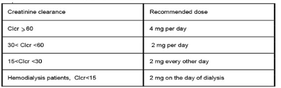 Elderly patients should receive 2 mg once daily for one week, then 4 mg once daily the next week, before increasing the dose up to 8 mg once daily depending on renal function.