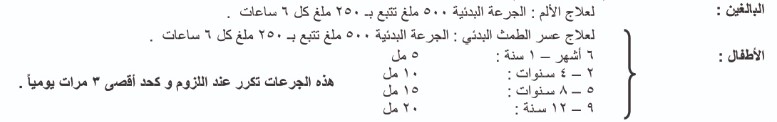 • الجرعة وطريقة الإعطاء:١. البالغين والمراهقين من ١٢ سنة من العمر:المضغوطات الملبسة بالفيلم: ۱ – ۲ مضغوطة ملبسة بالفيلم تصل إلى 3 مرات يومياً. التحاميل (۱۰، ۸۰۰): ۱ تحميلة حتى ٣-٤ مرات يومياً.