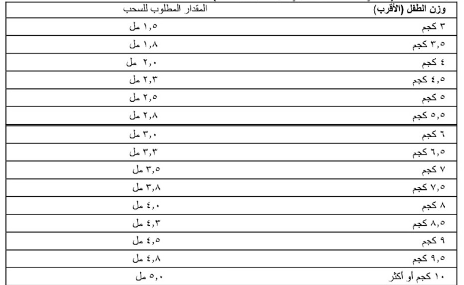 ابحث عن وزن الطفل على الجانب الأيمن من الجدول. يوضح العمود الموجود على يسار الجدول مقدار المزيج السائل الذي ستحتاج إلى سحبه. الرضع أقل من سنة واحدة (بما في ذلك الأطفال حديثي الولادة بكامل المدة)